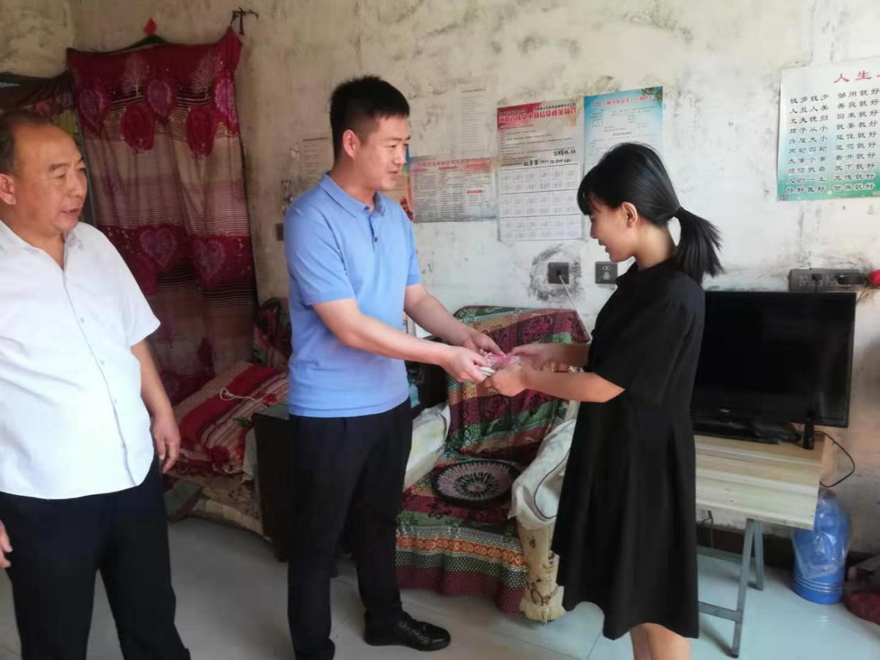 金秋将至,又是莘莘学子收获的季节,为进一步弘扬重视教育、尊重知识、鼓励成才的社会风气,帮助贫困大学生顺利进入大学校园。 8月31日,公司总经理助理曲笑辉,工会主席路建存在申村党支部书记郭庆法的陪同下,深入申村贫困家庭郭亭于家中,将8000元助学金送到利用高考结束的空闲时间刚刚打工回来的郭亭于手中。