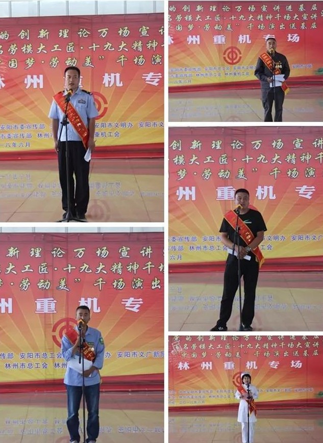 6月6日下午,安阳市党的创新理论万场宣讲进基层、百名劳模大工匠•十九大精神千场大宣讲暨“中国梦 劳动美”千场演出送基层巡回演出活动走进林州重机。河南省委宣传部副部长尹书博,省委宣传部理论处副处长杨小强,省委宣传部理论教育讲师团副团长赵琳,安阳市委宣传部副部长冀晓东,安阳市委宣传部理论科长龙晨曦,安阳市总工会宣教部部长张艾敏,林州市委常委、宣传部长王献青,林州市总工会主席栗旺生,副主席张晓云, 公司党委副书记、副总经理赵正斌,党委委员、工会主席路建存及职工代表300余人等出席活动。