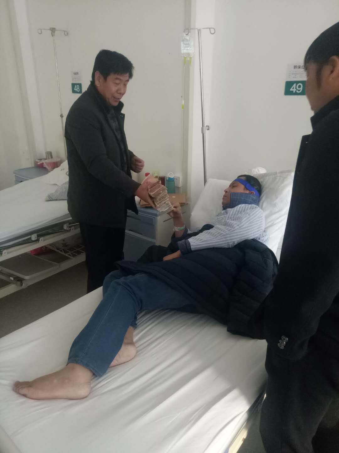 1月13日,公司工会主席路建存受公司董事长郭现生、总经理郭钏的委托,亲自到郑大一附院看望了郭保红同志,并将募集到的42337元善款交到郭保红手中。郭保红含着眼泪说:感谢重机集团郭董事长和郭钏总经理,谢谢重机集团的全体员工,我已不在重机上班了,但重机集团并没有忘记我,我和我家人一辈子都不会忘记重机领导和员工。路主席对郭保红说:你要安心养病,积极配合治疗,重机永远是你的家,永远是你的坚强后盾,相信你一定会战胜病魔,早日康复。